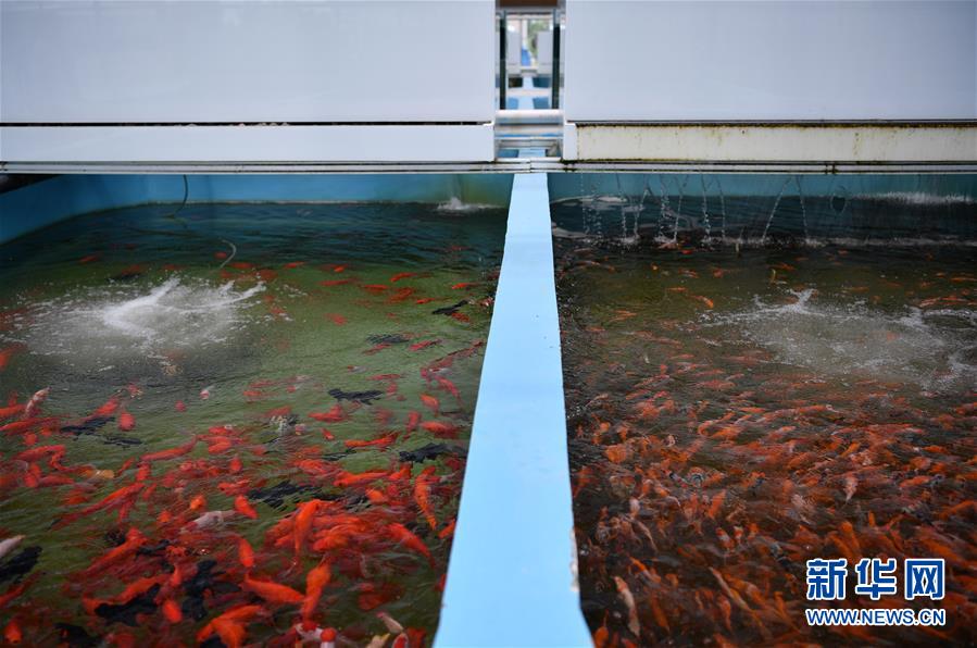 在天津現(xiàn)代晨輝科技集團有限公司的養(yǎng)殖示范場,工人在投喂飼料(6月15日攝)。近年來,天津市寶坻區(qū)大白莊鎮(zhèn)大力發(fā)展觀賞魚養(yǎng)殖,在當?shù)佚堫^企業(yè)的帶動下,成為增加農(nóng)民收入的新途徑。據(jù)了解,企業(yè)對附近養(yǎng)殖戶統(tǒng)一提供苗種、飼料、技術(shù)支持,以及觀賞魚成魚后保價回收的服務(wù)。養(yǎng)殖戶每畝水面平均收入約1.8萬元,解決周邊農(nóng)民就業(yè)近200人。新華社記者 李然 攝