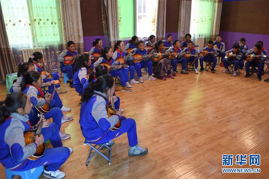 6月14日,孩子們?cè)诎慰h民族寄宿制小學(xué)內(nèi)的少年宮里用曼陀鈴進(jìn)行彈唱。新華社記者 劉坤 攝