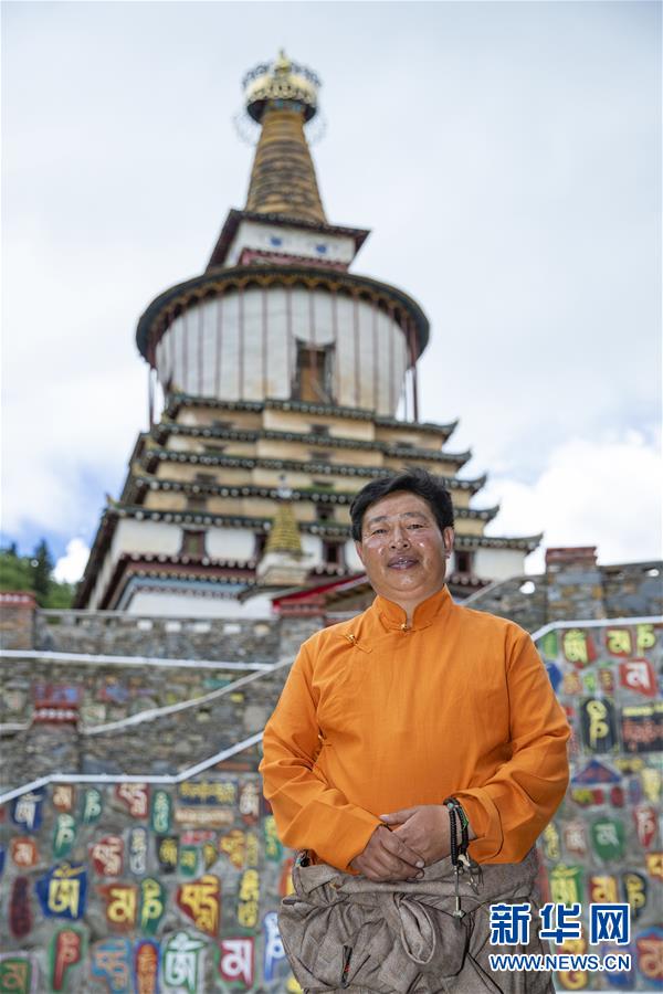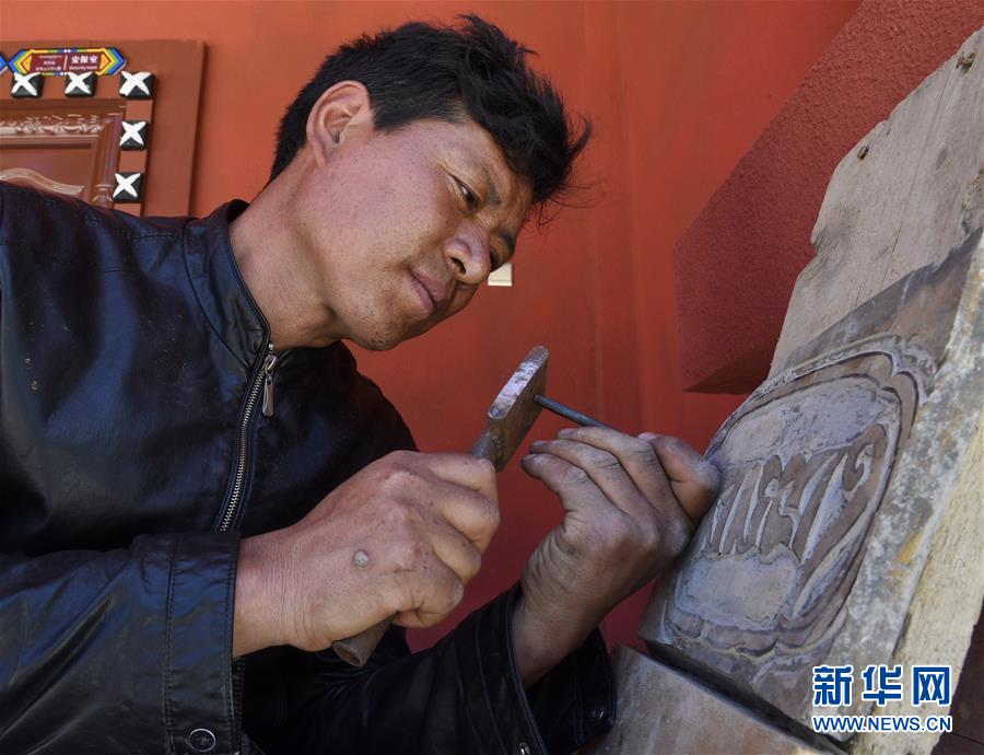 這是在四川省阿壩藏族羌族自治州壤塘縣棒托石刻公園拍攝的石刻傳習(xí)所所長(zhǎng)班瑪羅爾吾(6月13日攝)。新華社記者 沈伯韓 攝