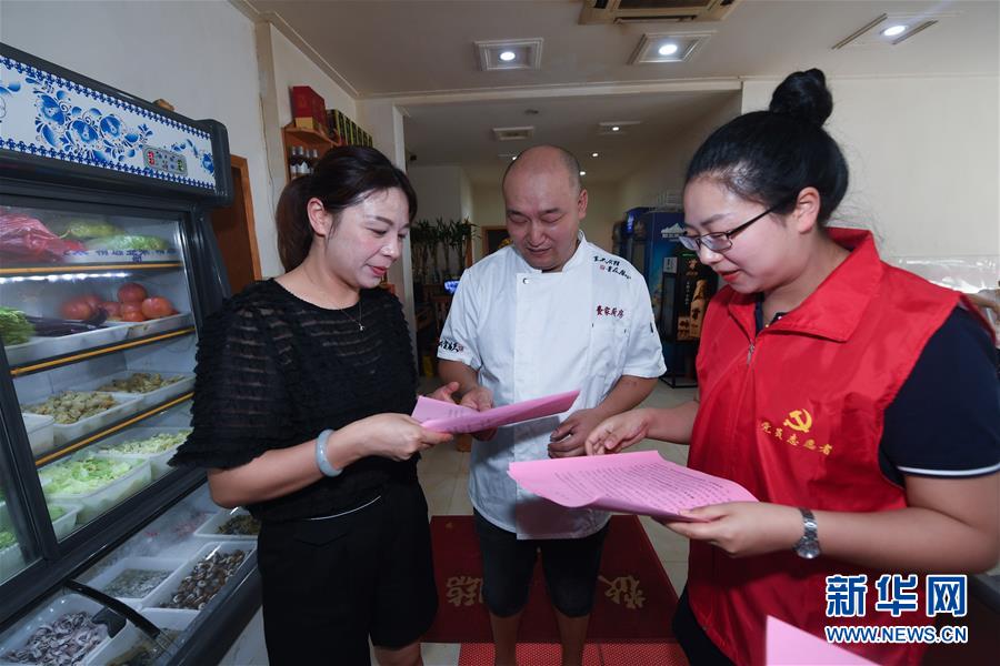 6月17日,黨員志愿者(右)在東林鎮(zhèn)一家農(nóng)家樂內(nèi)給經(jīng)營戶發(fā)放野生動物保護(hù)及禁食倡議書。新華社記者 徐昱 攝