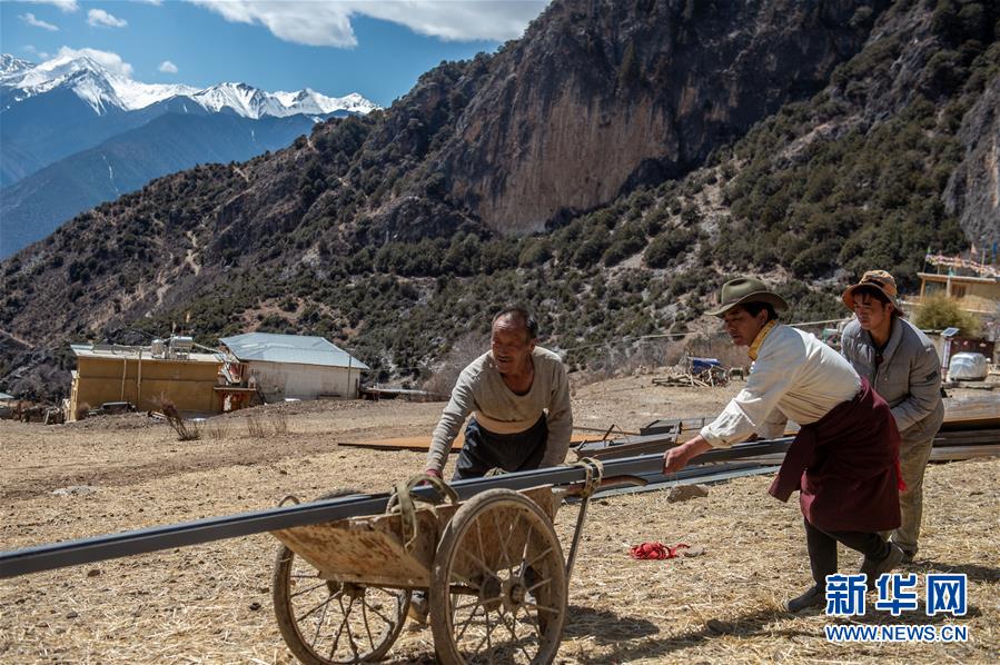 德欽縣佛山鄉(xiāng)江坡村說打村村民斯那定主(中)和村民一起搬運(yùn)建筑材料(3月14日攝)。新華社記者 胡超 攝
