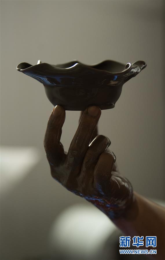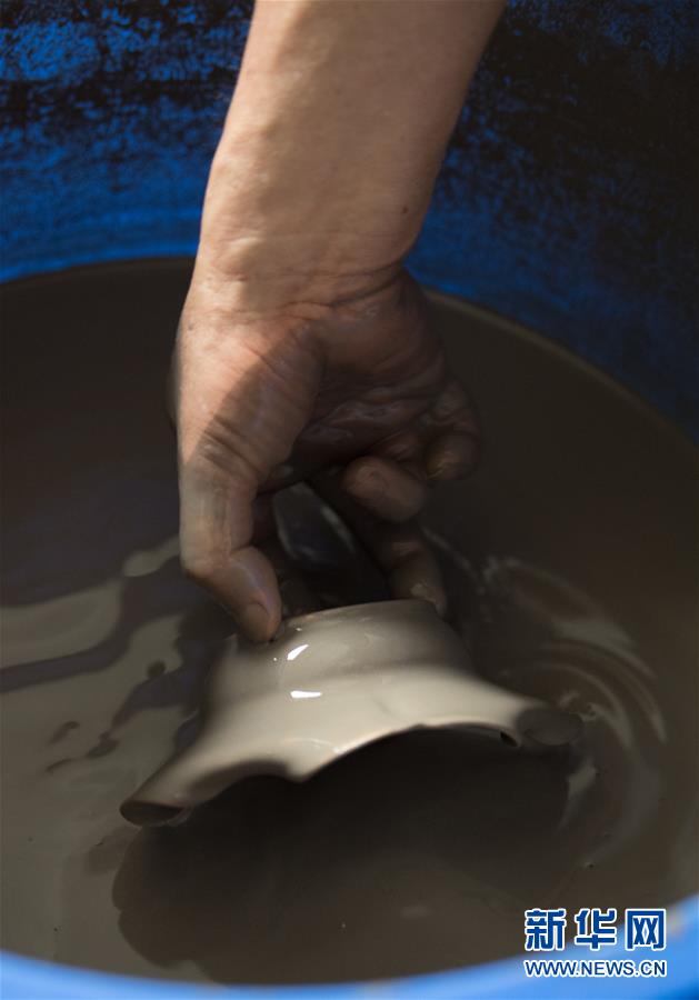 6月17日,在位于浙江慈溪的工作室,聞長慶將一件盞托浸入用本地草木灰調(diào)制的釉料中。新華社記者 翁忻旸 攝