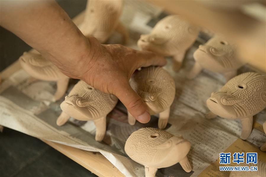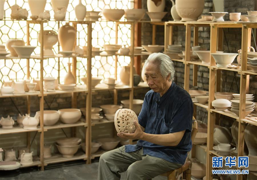 6月17日,在位于浙江慈溪的工作室,聞長慶查看一件素?zé)蟮捏蛤艹幍?。新華社記者 翁忻旸 攝