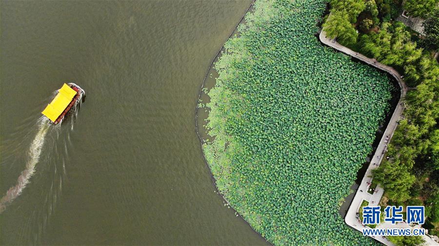 6月19日拍攝的大明湖畔的荷花池(無人機照片)。近日,山東濟南大明湖的荷花陸續(xù)綻放,吸引游客前來觀賞。新華社記者 王凱 攝