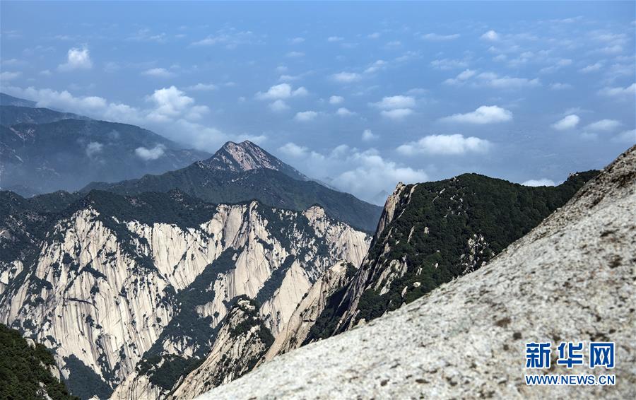 6月18日,白云飄動(dòng)下的華山。當(dāng)日,西岳華山經(jīng)歷連續(xù)三天暴雨后,迎來燦爛的陽光。新華社記者 陶明 攝
