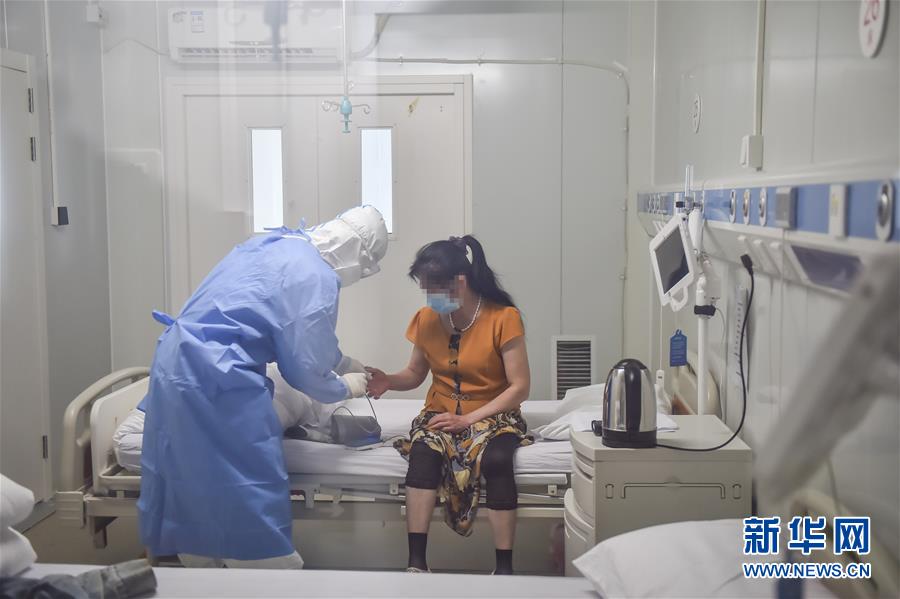 6月19日,在北京地壇醫(yī)院隔離病房?jī)?nèi),護(hù)士給新入住的病人做檢查。新華社記者彭子洋攝