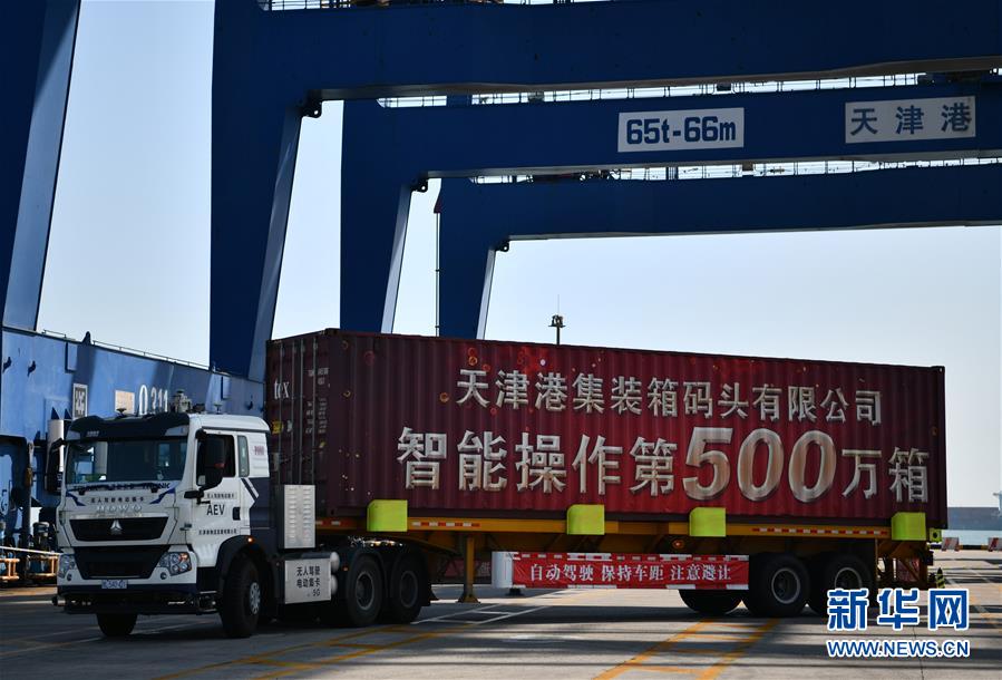 在天津港集裝箱碼頭有限公司北區(qū)智能碼頭自動(dòng)化堆場(chǎng),裝載著集裝箱的無(wú)人駕駛電動(dòng)集裝箱卡車向碼頭駛?cè)ィ?019年9月26日攝)。新華社記者李然攝
