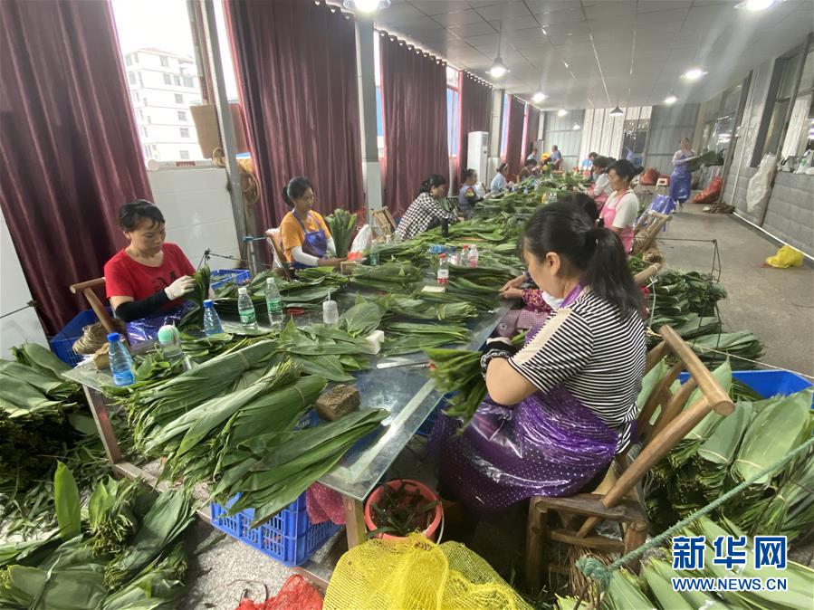 6月16日,桑植金橋農(nóng)產(chǎn)品有限責(zé)任公司的員工對(duì)粽葉進(jìn)行選葉、分級(jí)。新華社記者阮周圍攝