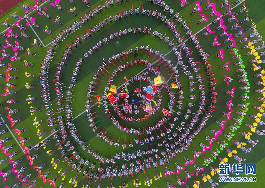 在廣西融水苗族自治縣民族體育公園,當(dāng)?shù)厝罕娫谔J笙斗馬節(jié)開(kāi)幕式上表演歌舞(無(wú)人機(jī)照片,2017年11月18日攝)。新華社記者黃孝邦攝