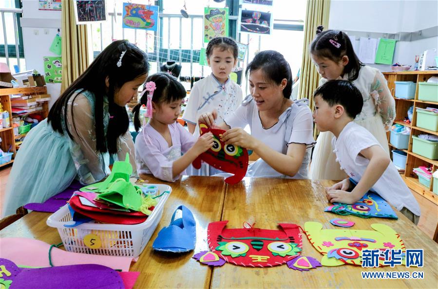 6月23日,長興縣開發(fā)區(qū)實(shí)驗(yàn)幼兒園的孩子們在教師指導(dǎo)下學(xué)做虎頭鞋、虎頭帽。為了迎接即將到來的端午節(jié),浙江省湖州市長興縣各個(gè)幼兒園開展“品民俗迎端午”主題活動(dòng),讓小朋友們體驗(yàn)傳統(tǒng)民俗文化。新華社記者徐昱攝