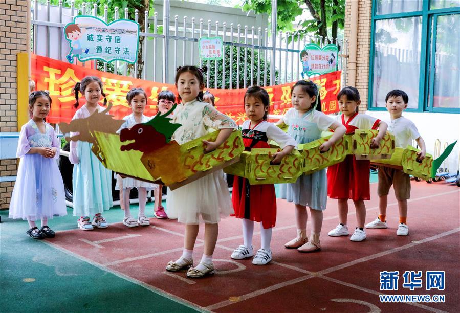 6月23日,長興縣開發(fā)區(qū)實(shí)驗(yàn)幼兒園的孩子們用廢舊的紙箱做成“龍舟”進(jìn)行表演。為了迎接即將到來的端午節(jié),浙江省湖州市長興縣各個(gè)幼兒園開展“品民俗迎端午”主題活動(dòng),讓小朋友們體驗(yàn)傳統(tǒng)民俗文化。新華社記者徐昱攝