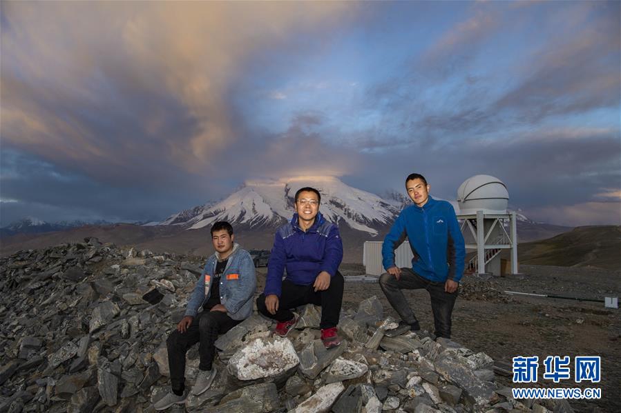 在中國(guó)科學(xué)院新疆天文臺(tái)慕士塔格觀測(cè)站,天文科技工作者馮國(guó)杰(中)、助理觀測(cè)員努爾蘭·卡納皮亞(左)、阿克力·圖拉提在慕士塔格峰下合影(6月15日攝)。
