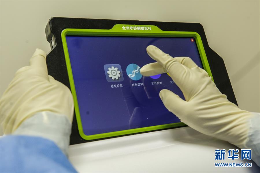 6月23日,檢驗人員操作全自動核酸提取儀。6月15日,北京市普仁醫(yī)院PCR實驗室正式啟用,并立即投入到新冠肺炎病毒核酸檢測工作之中,為新冠肺炎疫情防控增添利器。普仁醫(yī)院PCR實驗室啟用以來,除了來自本院發(fā)熱門診、門急診、病房和核酸檢測采樣點的樣本之外,還承接了社區(qū)以及東城區(qū)集中核酸檢測點采集的部分樣本。新華社記者張玉薇攝