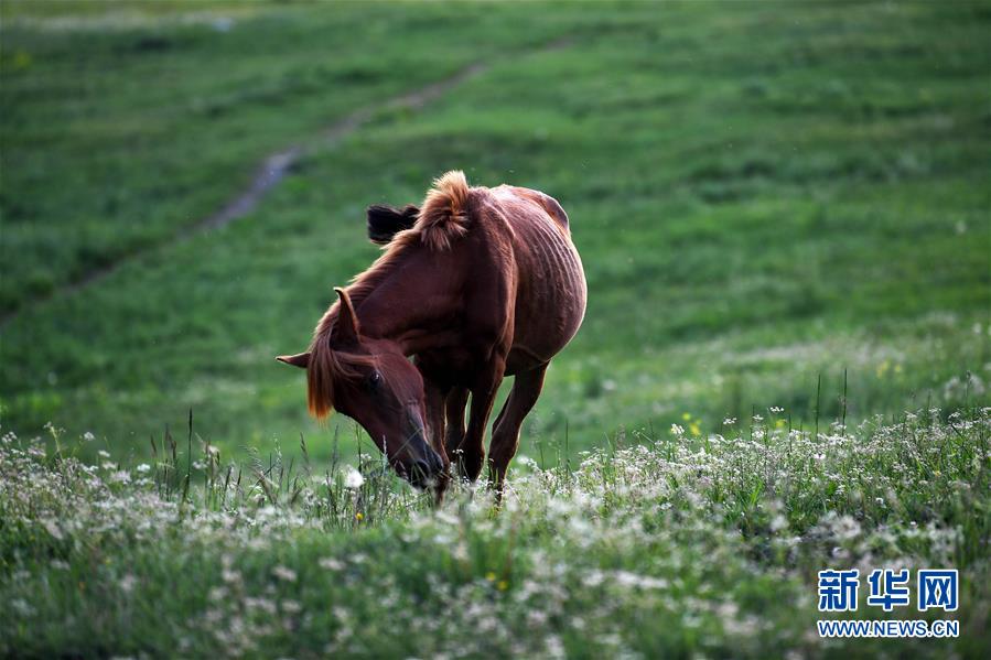 一匹馬在新疆喀納斯景區(qū)內(nèi)吃草(6月24日攝)。新華社記者 沙達提 攝
