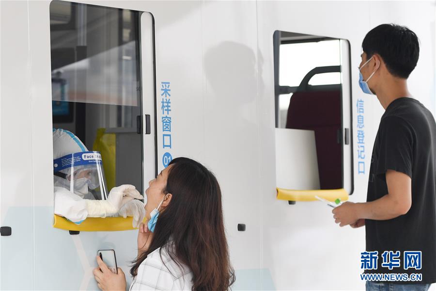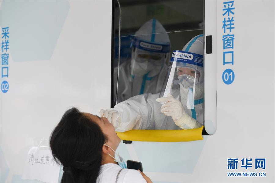 6月28日,在北京市西城區(qū)北京展覽館南側(cè)的露天廣場(chǎng)核酸檢測(cè)采樣點(diǎn),核酸檢測(cè)采樣車內(nèi)的醫(yī)護(hù)人員為前來做檢測(cè)的人員進(jìn)行采樣。新華社記者鞠煥宗攝