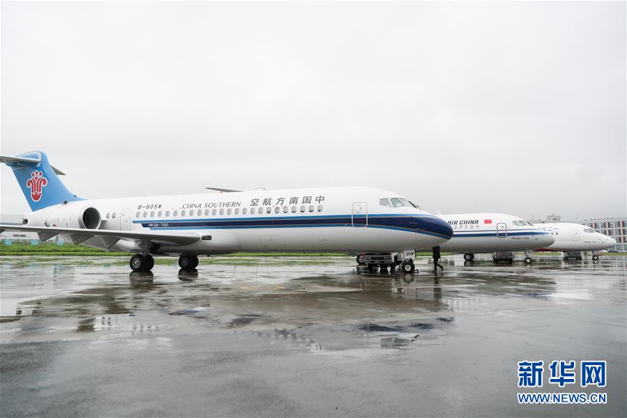 6月28日,三架嶄新涂裝的國產(chǎn)新支線客機(jī)ARJ21飛機(jī)停放在中國商用飛機(jī)有限責(zé)任公司總裝基地內(nèi)。當(dāng)日,三架嶄新涂裝的國產(chǎn)新支線客機(jī)ARJ21飛機(jī)在位于上海浦東的中國商用飛機(jī)有限責(zé)任公司總裝基地集結(jié),分別交付給國航、東航、南航三大航空公司,標(biāo)志著ARJ21進(jìn)入我國主流民航市場。新華社記者丁汀攝