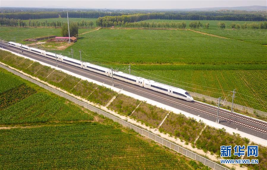 一列“和諧號(hào)”動(dòng)車組列車行駛在內(nèi)蒙古赤峰市元寶山區(qū)的田野間(6月30日攝,無人機(jī)照片)。新華社記者彭源攝