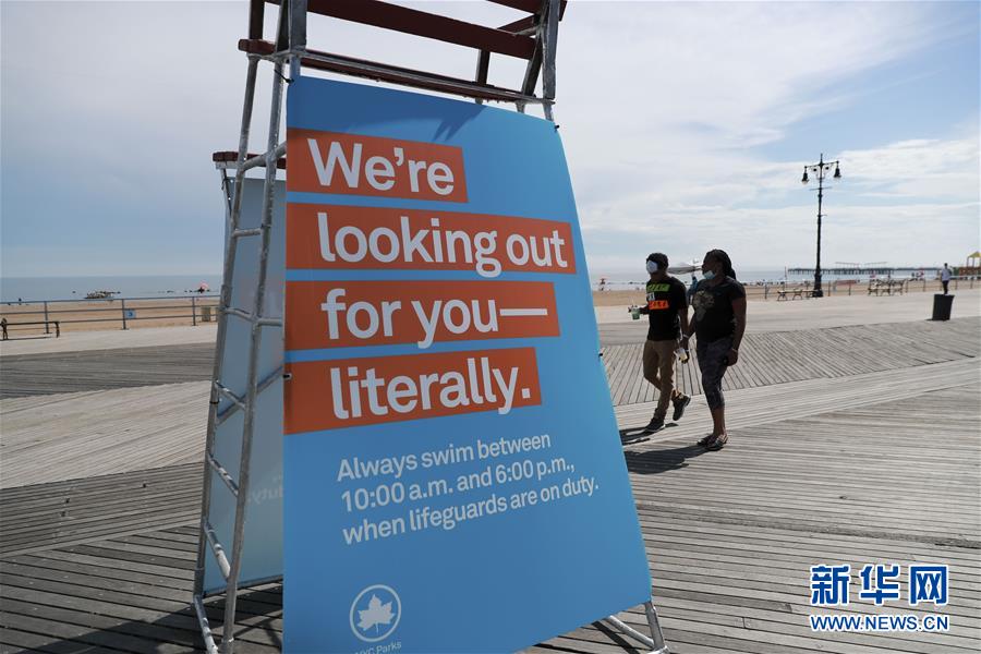 這是7月1日在美國紐約科尼島一處海灘上拍攝的關于允許游泳時間的提示牌。當日,美國紐約市屬八處海灘正式重新準許民眾游泳,救生員也同時上崗。新華社記者王迎攝