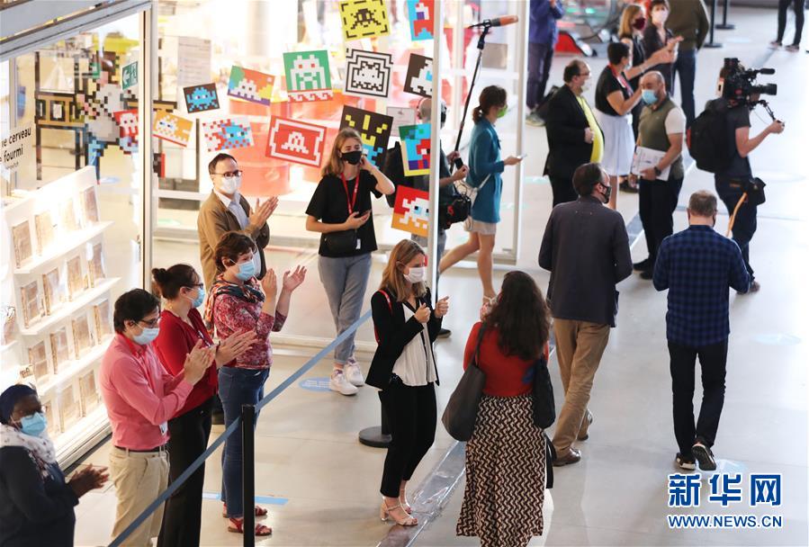 7月1日,法國(guó)巴黎蓬皮杜藝術(shù)中心的工作人員鼓掌歡迎參觀者。因新冠疫情關(guān)閉的法國(guó)巴黎蓬皮杜藝術(shù)中心于7月1日重新開門迎客。目前,中心只開放6層的臨時(shí)展區(qū)和4、5層的現(xiàn)代藝術(shù)常設(shè)展區(qū)。參觀者需提前網(wǎng)上預(yù)約參觀時(shí)段,11歲以上參觀者須佩戴口罩,參觀過(guò)程中保持安全距離。新華社記者高靜攝
