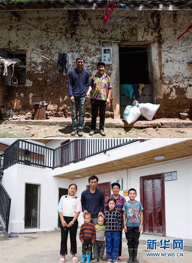 拼版圖片:上圖為且沙次干、阿達么日雜夫婦倆在阿布洛哈村3組老屋土坯房前留影(6月27日攝);下圖為且沙次干一家人在集中安置點新居前留影(6月30日攝)。