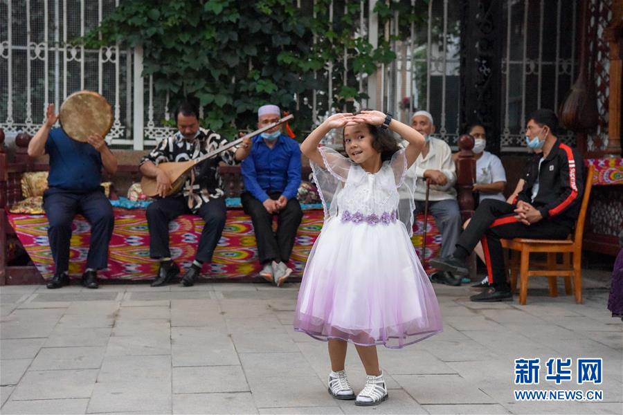 在烏魯木齊大巴扎景區(qū),小朋友跟著音樂起舞(7月4日攝)。夏日周末,烏魯木齊市大巴扎景區(qū)內(nèi)熙熙攘攘,人們來到這里品嘗美食、休閑購物。2018年,經(jīng)過靚化改造后的大巴扎景區(qū)新增長(zhǎng)約800米的步行街,分為文創(chuàng)文旅和“非遺”項(xiàng)目街區(qū)、國際時(shí)尚街區(qū)和大巴扎美食街區(qū),是烏魯木齊最受歡迎的旅游目的地之一。新華社記者丁磊攝