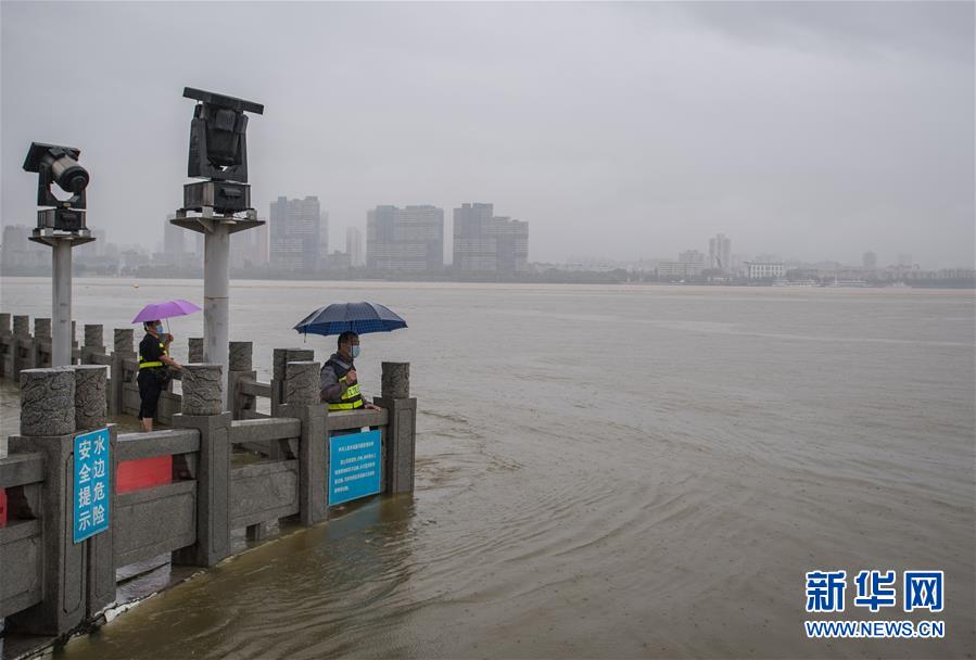 7月6日,工作人員在武漢龍王廟觀察水情。記者6日從武漢市防汛抗旱指揮部辦公室獲悉,5日以來,武漢遭暴雨襲擊,全市多處路段漬水。至6日4時,長江漢口站超設防水位1.79米,漢江新溝站超警戒水位0.01米。鑒于當前水雨汛情和漬澇情況,武漢市從6日5時起,將排澇應急響應級別提升至Ⅱ級;從6時30分起,將防汛應急響應級別提升至Ⅱ級。新華社記者肖藝九攝
