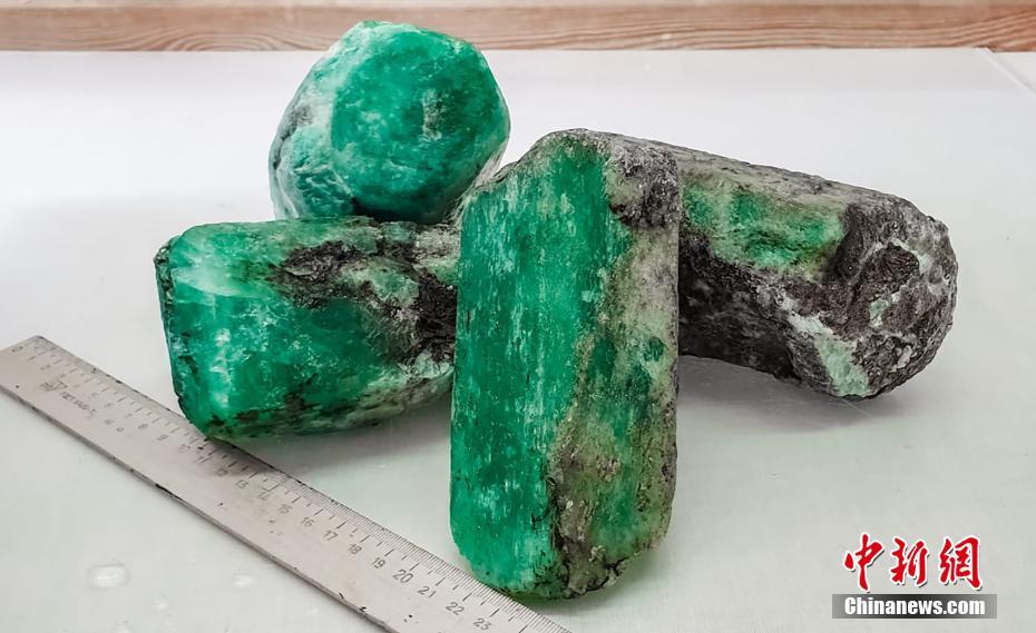 當?shù)貢r間7月7日,俄羅斯斯維爾德洛夫斯克州,俄羅斯國家技術集團在馬林斯克礦區(qū)內(nèi)發(fā)現(xiàn)總重量達4.8公斤的4塊綠寶石,是最近20年來發(fā)現(xiàn)的同類品質(zhì)中最大的寶石。圖片來源:視覺中國