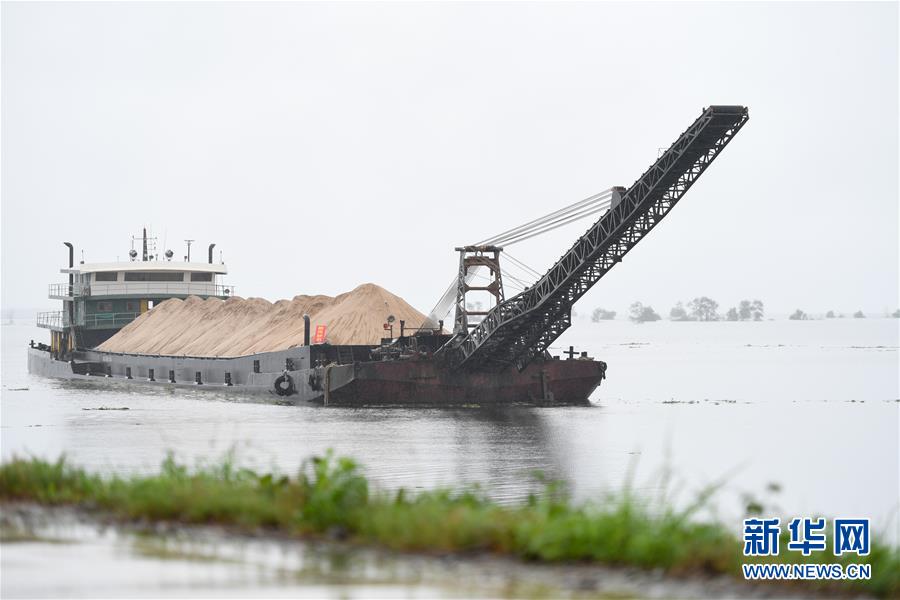 在益陽市大通湖區(qū)東大堤附近水域,一艘船采取“以船代倉”方式儲備防汛物資(7月8日攝)。新華社記者陳澤國攝