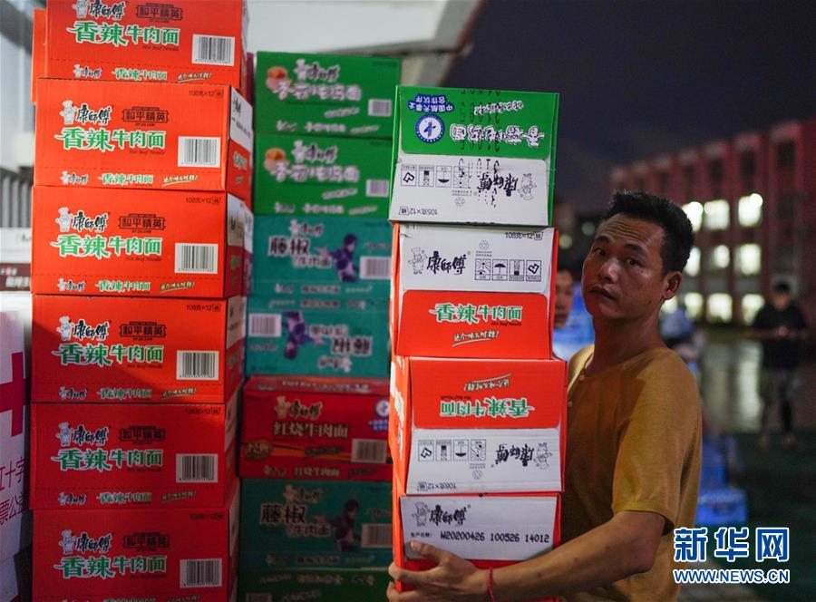 7月9日,工作人員在搬運供安置點村民食用的方便面。當日,江西鄱陽縣鄱陽鎮(zhèn)因洪水受災的村民被轉移到多個集中安置點。在鄱陽縣五一中心學校安置點,志愿者和工作人員接到任務后不到十小時內(nèi),為被轉移村民布置了28間教室,供519人安頓,并為村民發(fā)放褥子、床單、枕頭、盒飯、飲用水等物資。新華社記者周密攝