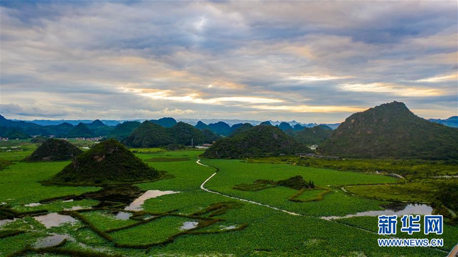 這是7月8日拍攝的普者黑國(guó)家濕地公園的夕陽(yáng)景觀(無(wú)人機(jī)照片)。