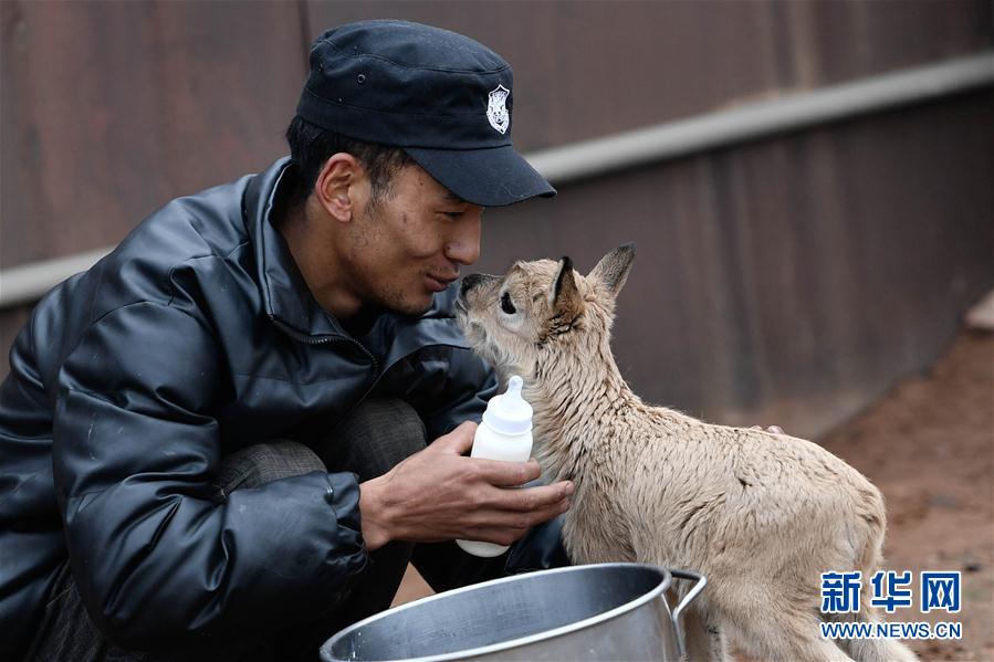 7月7日,三江源國家公園管理局長江源園區(qū)可可西里管理處卓乃湖保護(hù)站的工作人員才文多杰在給藏羚羊幼仔喂奶。