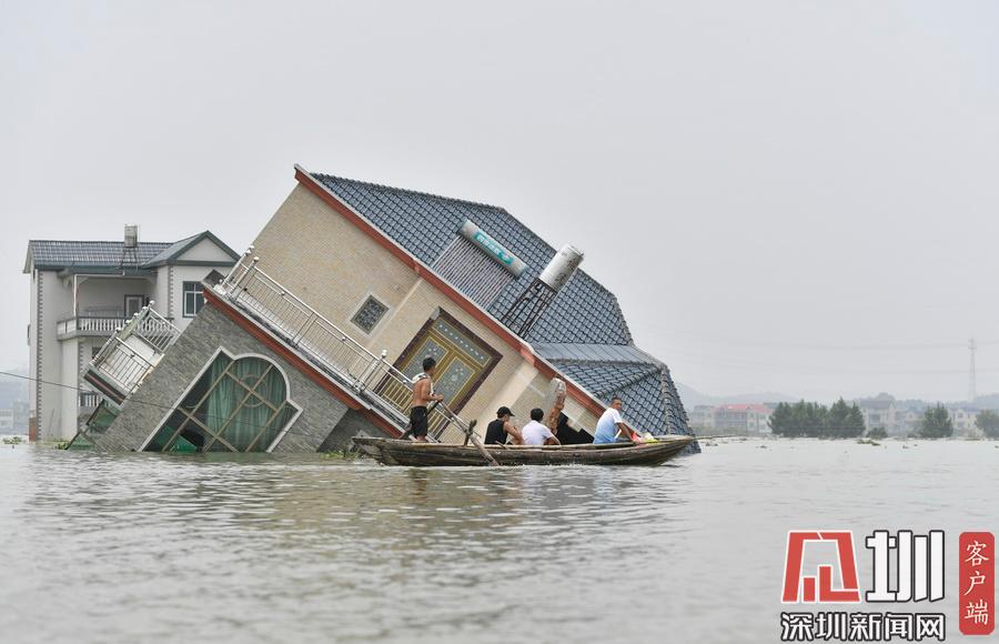 江西鄱陽村莊洪水圍困 留守村民劃船外出取生活物資
