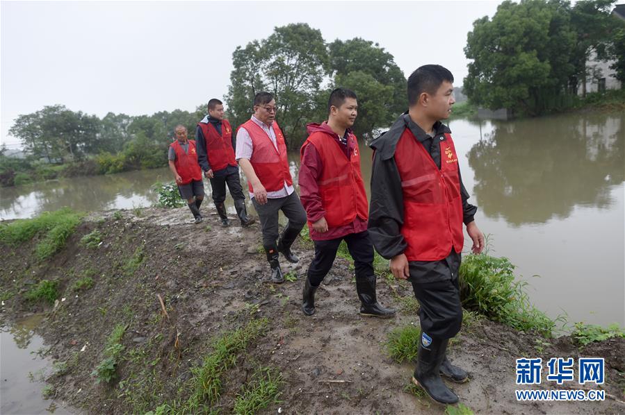 7月17日,基層網(wǎng)格員和志愿者在秀洲區(qū)新塍鎮(zhèn)小金港村的河道邊巡河。浙江省嘉興市秀洲區(qū)處在杭嘉湖平原,受持續(xù)強(qiáng)降雨及上游排水影響,近期,秀洲區(qū)境內(nèi)的京杭大運(yùn)河分支航道持續(xù)保持較高水位。當(dāng)?shù)叵嚓P(guān)部門嚴(yán)陣以待,落實(shí)各項(xiàng)措施,確保安全度汛。新華社記者韓傳號(hào)攝