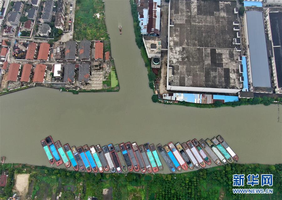 7月17日拍攝的秀洲區(qū)王江涇鎮(zhèn)境內(nèi)京杭大運河邊臨時停靠的船舶(無人機照片)。浙江省嘉興市秀洲區(qū)處在杭嘉湖平原的低洼地帶,受持續(xù)強降雨及上游排水影響,秀洲區(qū)境內(nèi)的京杭大運河分支航道持續(xù)保持較高水位。為確保安全度汛,秀洲區(qū)相關(guān)部門全力以赴做好防汛各項工作。新華社記者韓傳號攝
