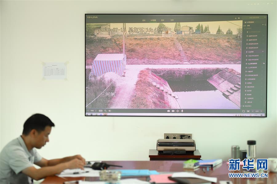 7月17日,在岳陽市華容縣治河渡鎮(zhèn)防汛抗旱指揮所,大屏實(shí)時(shí)顯示新華垸三門閘附近情況。為力爭安全度汛,湖南省岳陽市華容縣織密人防、物防、技防“三防”網(wǎng)絡(luò),加強(qiáng)應(yīng)急值守和巡查排險(xiǎn)工作,采取“以船代倉”“以車代倉”等多種方式靈活儲(chǔ)備防汛物資,在險(xiǎn)工險(xiǎn)段布置攝像頭實(shí)時(shí)監(jiān)控,利用無人機(jī)對人員難以到達(dá)的位置進(jìn)行巡查。新華社記者陳澤國攝