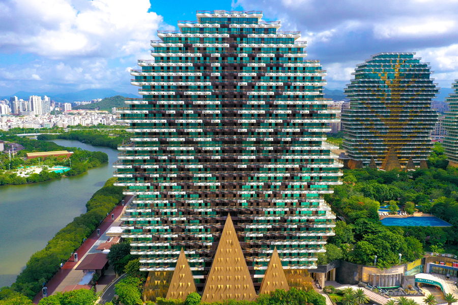 2020年7月20日,海南省三亞市,圖為航拍的“九棵大樹”建筑群,其具象性的建筑設(shè)計風(fēng)格,既有建筑之美,又見自然靈韻。