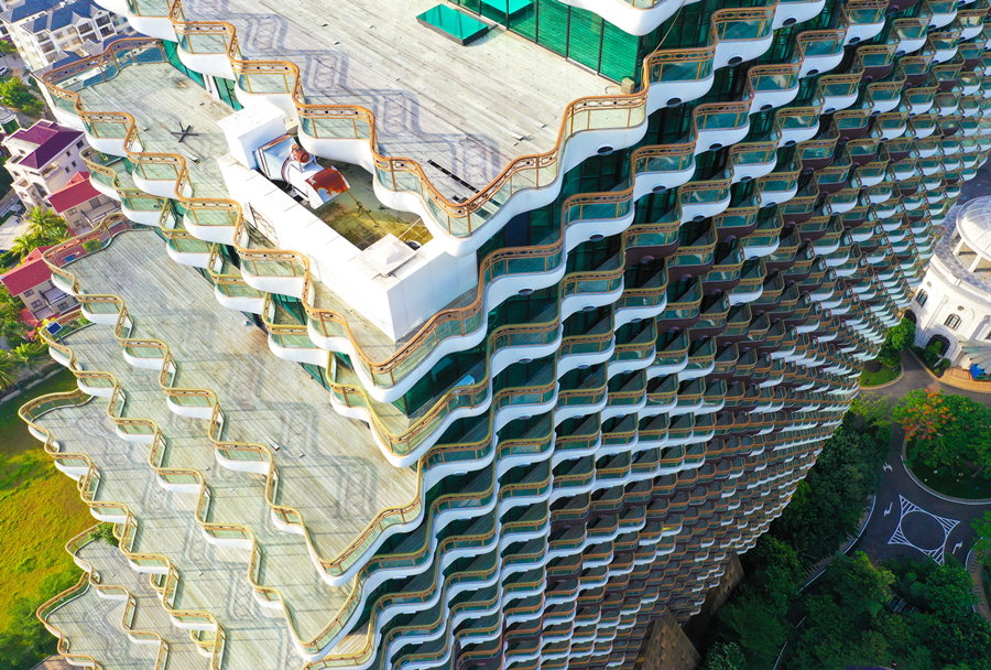 2020年7月20日,海南省三亞市,圖為航拍的“九棵大樹”建筑群。建筑物陽臺均為波浪形,視野良好,契合三亞“海”的屬性。