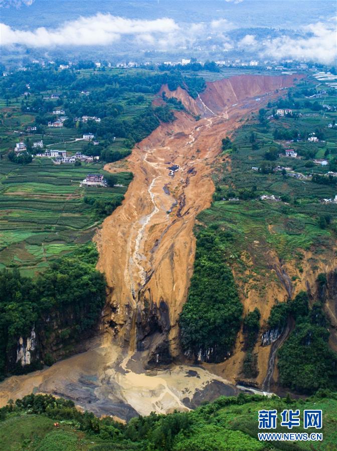 7月22日拍攝的因恩施州屯堡鄉(xiāng)馬者村山體滑坡形成的堰塞湖(無人機(jī)照片)。