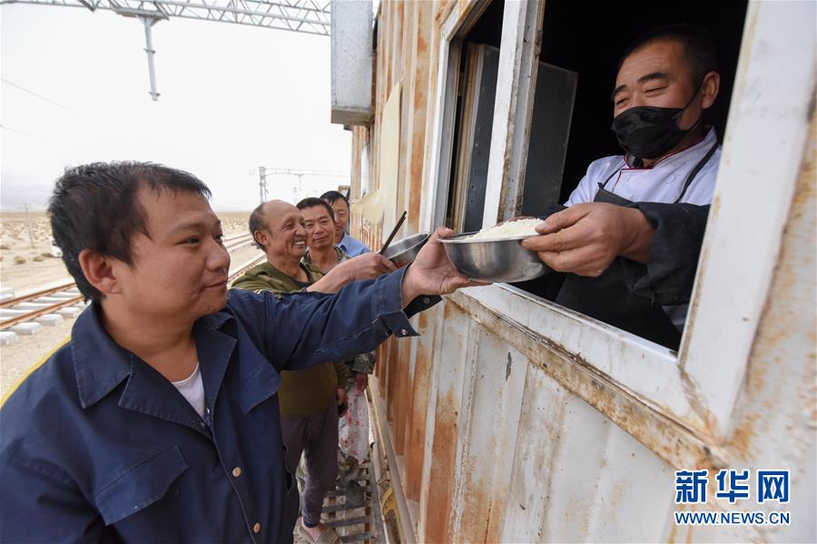 在索爾庫(kù)里宿營(yíng)地,中鐵一局的施工人員排隊(duì)打飯(7月19日攝)。新華社記者 丁磊 攝