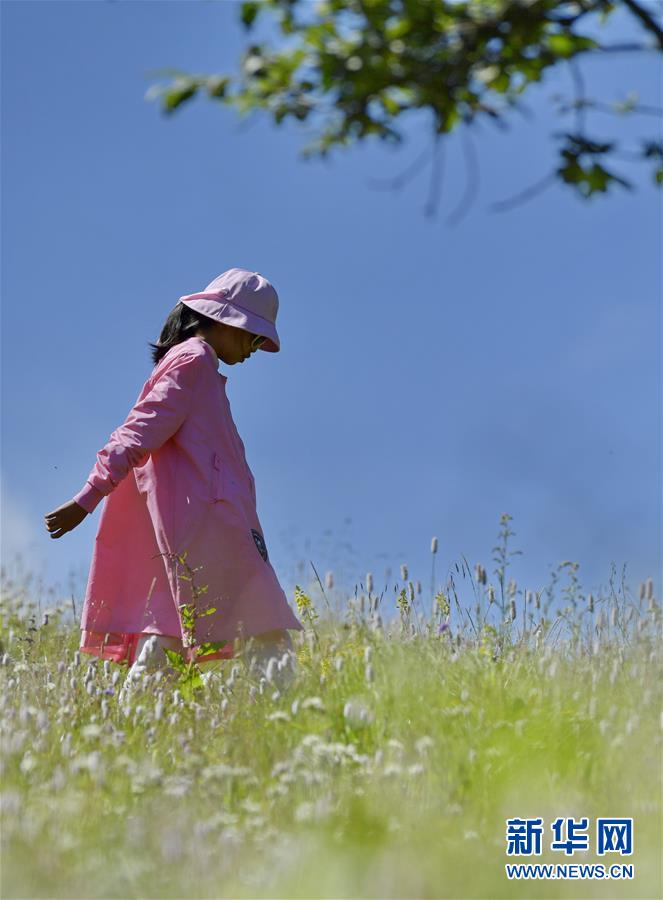一名游客在魯朗旅游小鎮(zhèn)的高山牧場游玩(7月26日攝)。新華社記者 張汝鋒 攝
