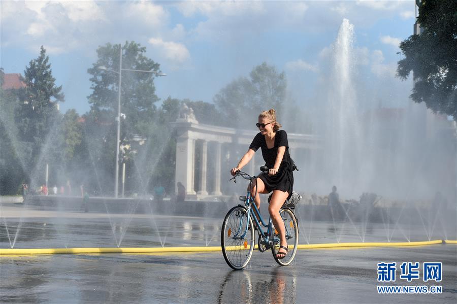 7月28日,在奧地利維也納,一名女子騎車經過一處廣場的噴水設施。當日,維也納市中心的最高氣溫達到37.2攝氏度,不少市民戲水消暑。新華社記者郭晨攝