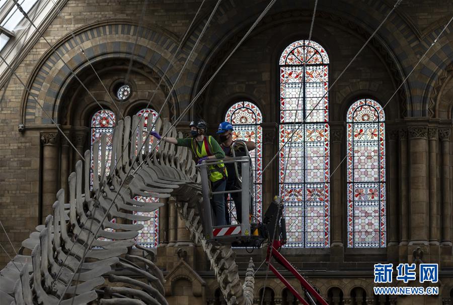 7月27日,工作人員在英國(guó)倫敦的自然歷史博物館大廳內(nèi)清潔一具藍(lán)鯨骨架。受新冠疫情影響關(guān)閉數(shù)月的英國(guó)自然歷史博物館將于8月5日重新對(duì)外開放,目前館方正在為重新開放做最后準(zhǔn)備。參觀者需要提前預(yù)約參觀時(shí)段、全程佩戴口罩且保持安全距離。新華社記者韓巖攝