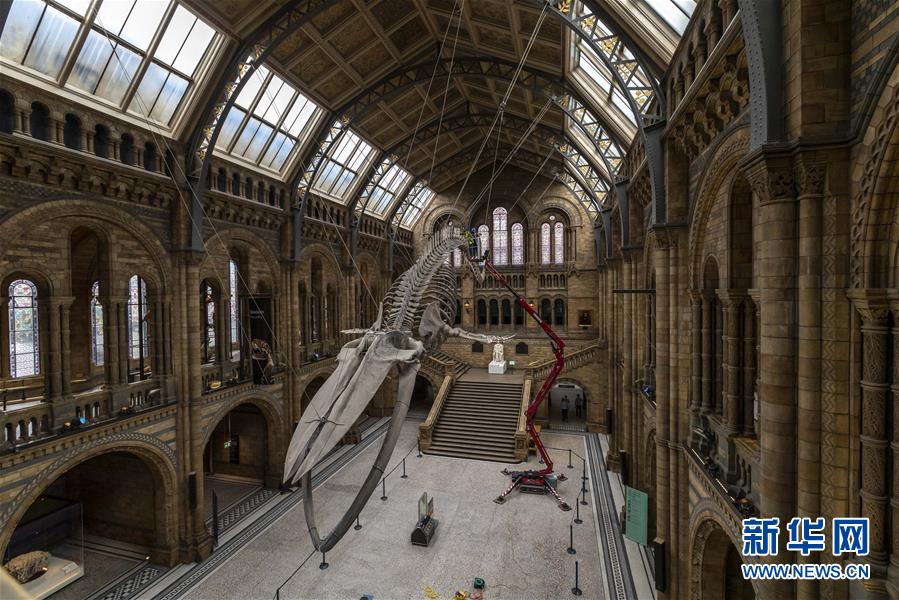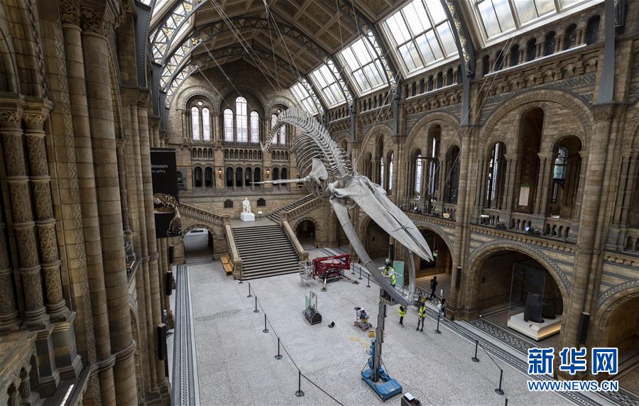 7月27日,一名工作人員在英國(guó)倫敦的自然歷史博物館大廳內(nèi)清潔一具藍(lán)鯨骨架。受新冠疫情影響關(guān)閉數(shù)月的英國(guó)自然歷史博物館將于8月5日重新對(duì)外開放,目前館方正在為重新開放做最后準(zhǔn)備。參觀者需要提前預(yù)約參觀時(shí)段、全程佩戴口罩且保持安全距離。新華社記者韓巖攝