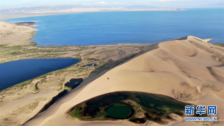 這是青海湖沙島風(fēng)光(7月28日攝,無人機(jī)照片)。盛夏傍晚,位于青海湖東北部的沙島,島內(nèi)湖泊星羅棋布,沙丘連綿起伏,風(fēng)景別致。金沙與湖水掩映,在陽光的勾勒下形成一幅美麗的畫卷。新華社記者張宏祥攝
