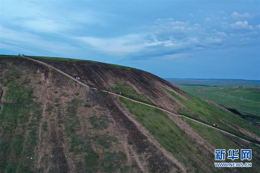 7月29日,游客在烏蘭哈達(dá)火山群的一座火山上游玩(無人機(jī)照片)。新華社記者劉磊攝