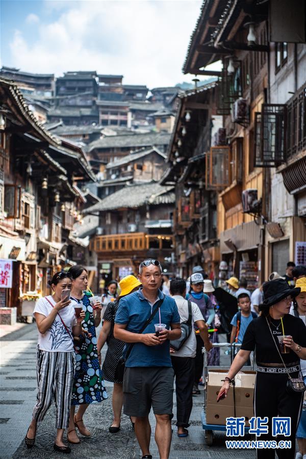 游客在貴州省雷山縣西江千戶苗寨景區(qū)內(nèi)游玩(7月31日攝)。新華社記者陶亮攝