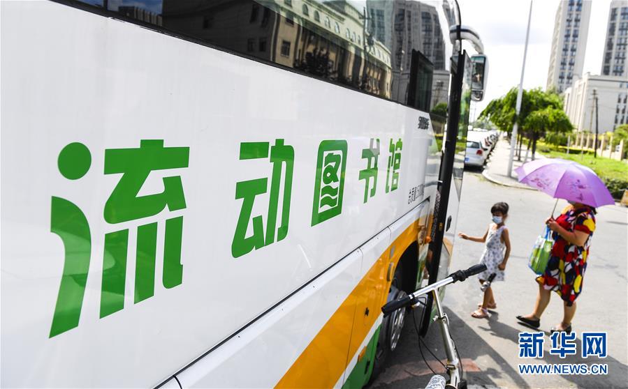 8月5日,在長春市一處社區(qū)服務(wù)點,一名市民騎行經(jīng)過“流動圖書館”。三千冊圖書,一輛大巴車,穿梭在城市的街頭巷尾。在吉林長春,長春市圖書館利用流動圖書車,定期在市內(nèi)15個固定服務(wù)點間巡回流動,為市民提供便捷的圖書借閱服務(wù)。新華社記者許暢攝