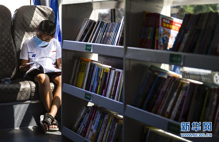 8月5日,一名小讀者在“流動圖書館”里看書。三千冊圖書,一輛大巴車,穿梭在城市的街頭巷尾。在吉林長春,長春市圖書館利用流動圖書車,定期在市內15個固定服務點間巡回流動,為市民提供便捷的圖書借閱服務。新華社記者許暢攝