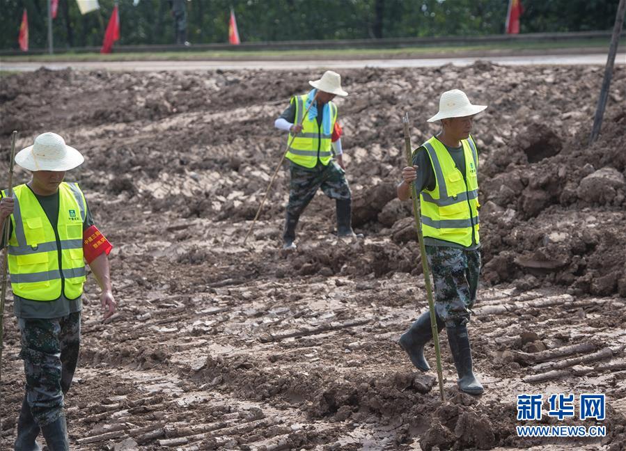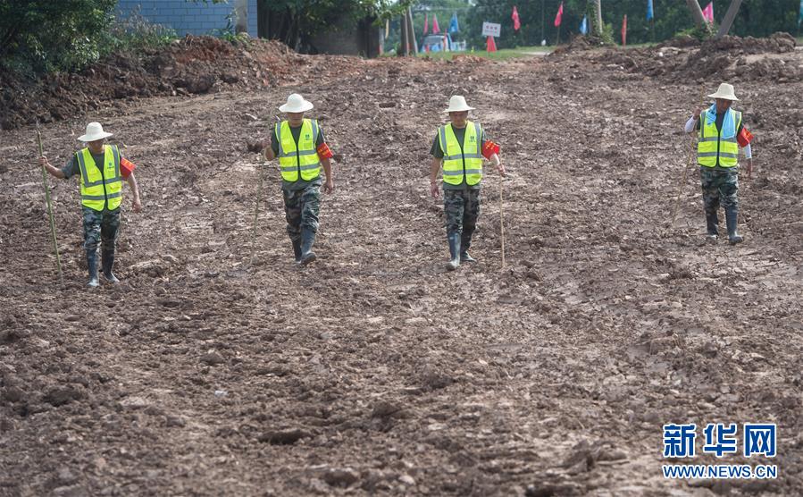 8月5日,夏德勤(右一)與同事在長江武金堤背水面巡查管涌情況。新華社記者肖藝九攝