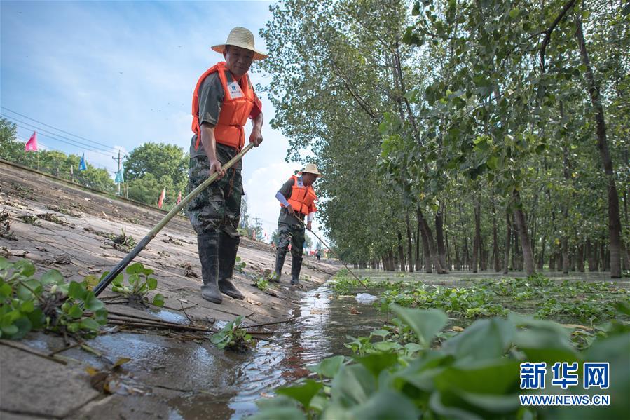 8月5日,夏德勤(左)與同事在長(zhǎng)江武金堤上巡查。新華社記者肖藝九攝